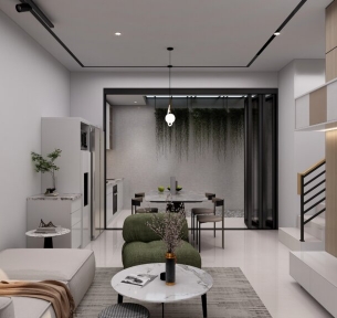 Bếp và phòng khách được thiết kế liên thông sẽ tạo thành một không gian mở, vừa làm rộng nhà, vừa phát huy hết sự đa năng trong sinh hoạt.