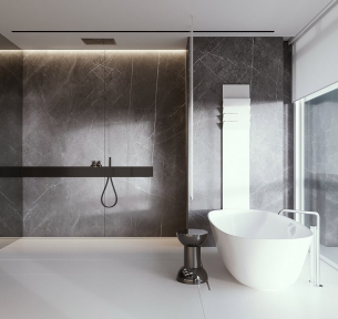 Tấm tường gỗ tinh xảo, đường ray chiếu sáng lõm cùng khối đá cẩm thạch đen sang trọng và đồ nội thất cao cấp tạo nên vẻ đẹp cho căn hộ hiện đại dưới đây.
